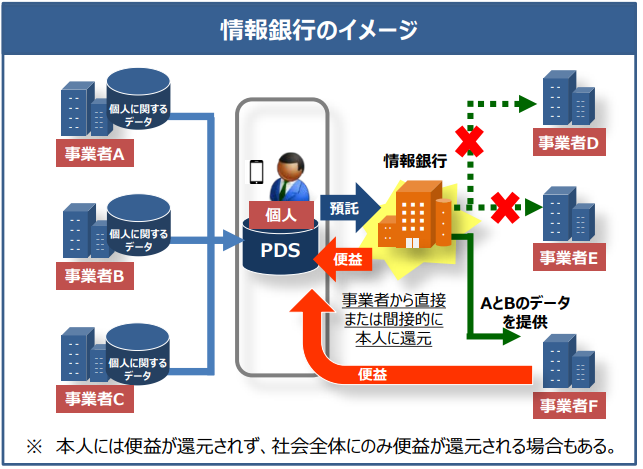 情報銀行(情報利用信用銀行)とは、個人とのデータ活用に関する契約等に基づき、PDS等のシステムを活用して個人のデータを管理するとともに、個人の指示又は予め指定した条件に基づき個人に代わり妥当性を判断の上、データを第三者(他の事業者)に提供する事業。