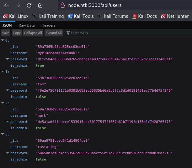 /api/usersにアクセスするとユーザー名とパスワードのハッシュが得られます。