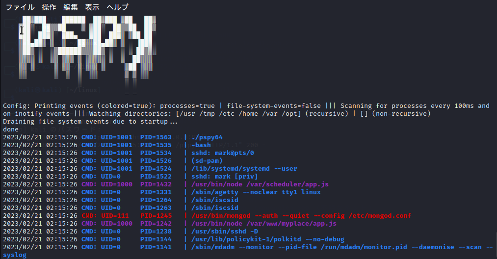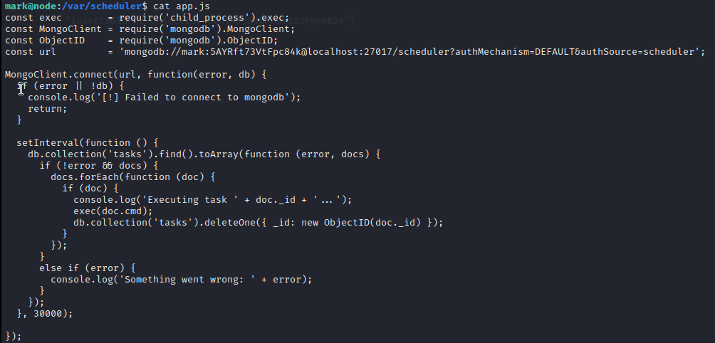 pspyを実行すると定期的に実行されている「CMD: UID=1000 PID=1208 | /usr/bin/node /var/scheduler/app.js」が確認できました。