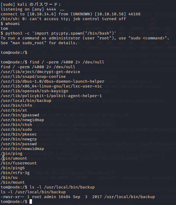 ※公式のWirteUpではBOFによる権限昇格が説明されていましたが、自分ではその方法で権限昇格ができませんでした。そのため、別の方法をとりました。